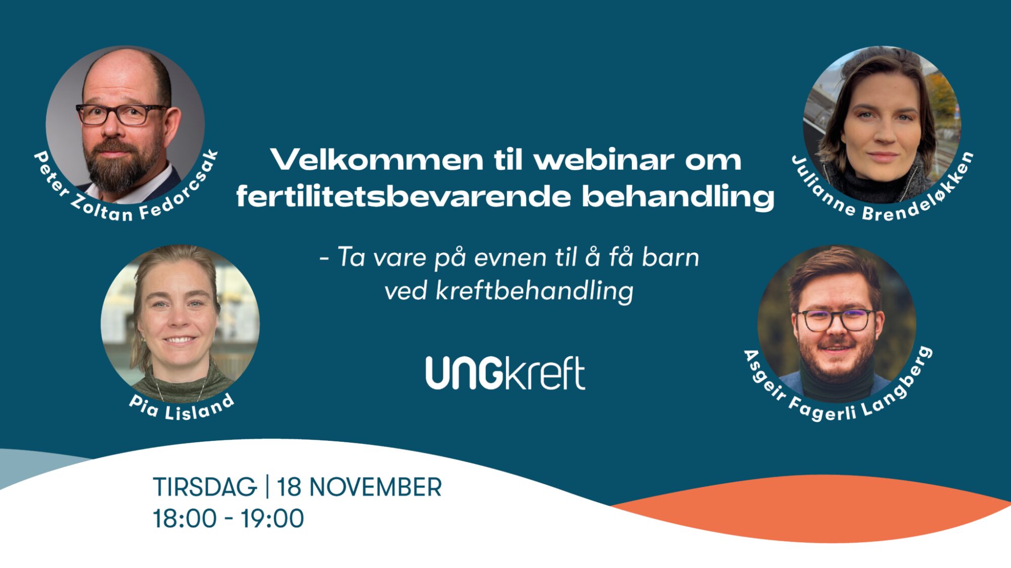 I dette webinaret vil du få informasjon fra fagperson om ulike muligheter som finnes for fertilitetsbevarende behandling i forbindelse med kreftbehandling. Videre vil du også få høre to personlige historier. Ung Kreft ser at mange har spørsmål både før og etter de har fått fertilitetsbevarende behandling. Hvordan går jeg frem for å bruke nedfryst egg, sæd eller eggstokkvev? Hvorfor fikk ikke jeg tilbud om fertilitetsbevarende behandling? Jeg har ingen muligheter til å få egne barn, hvilke muligheter har jeg til å starte egen familie da? Dette er temaer vi vil komme inn på i webinaret.