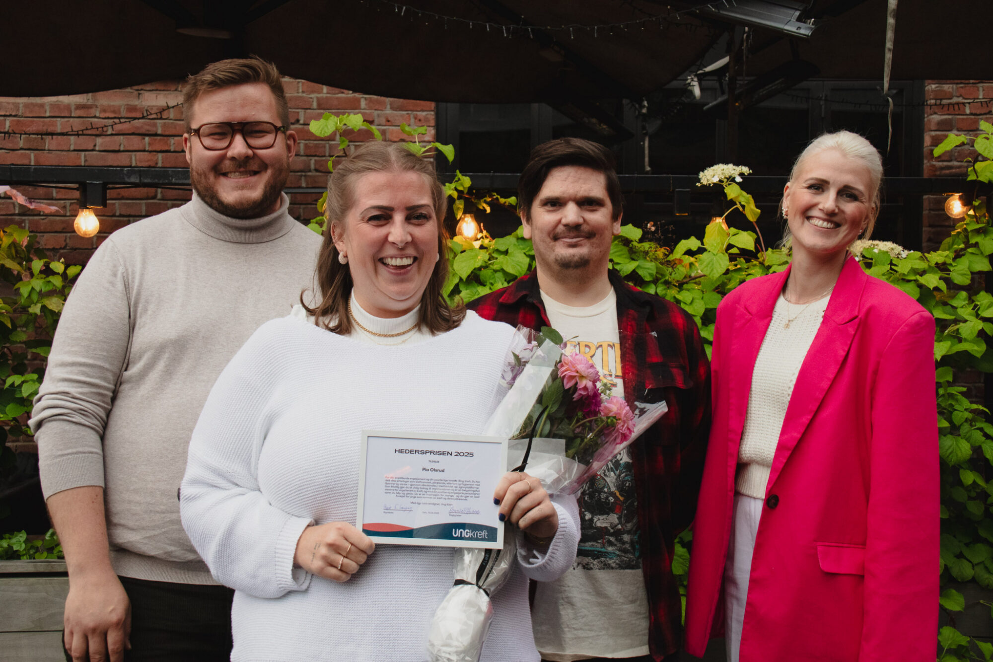 Pia Olsrud har mottatt hedersprisen for sitt engasjement i Ung Kreft og sin utrettelige stemme for unge som rammes av kreft. For Olsrud kom prisen som en stor overraskelse. "Jeg trodde noen tullet. Jeg ble så rørt at jeg begynte å gråte," forteller hun. "Bare det at den stemmen man tør å være blir så verdsatt av andre, det var veldig, veldig stas."