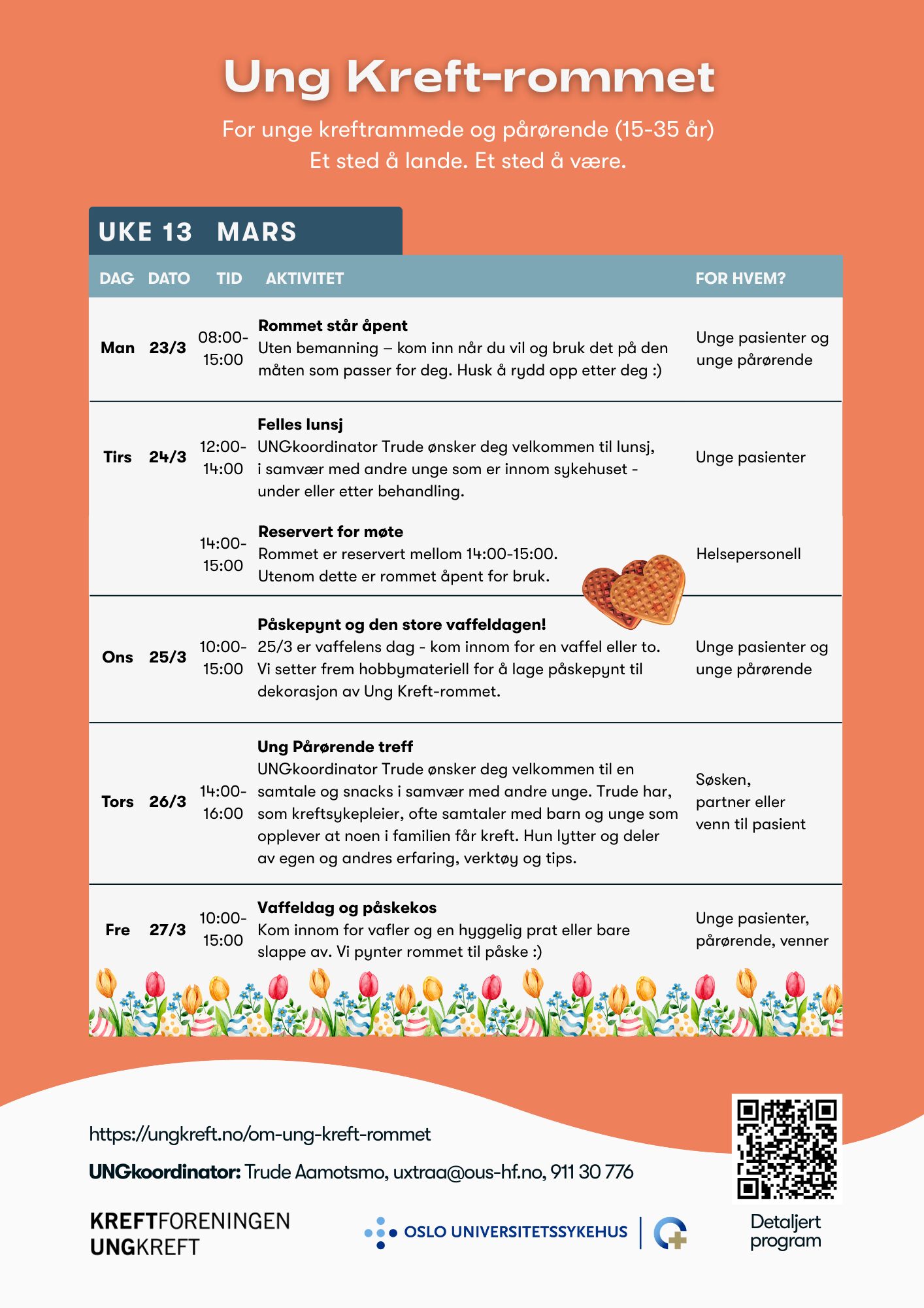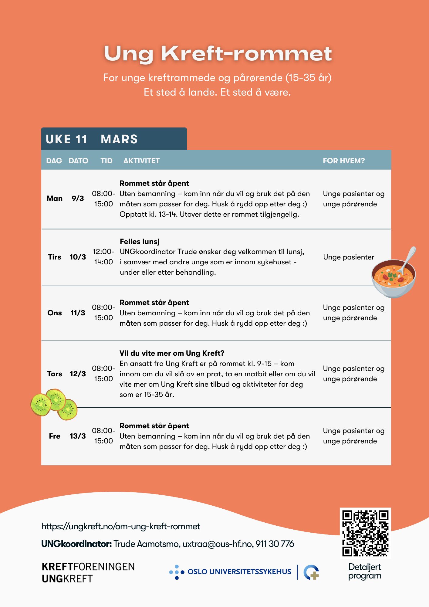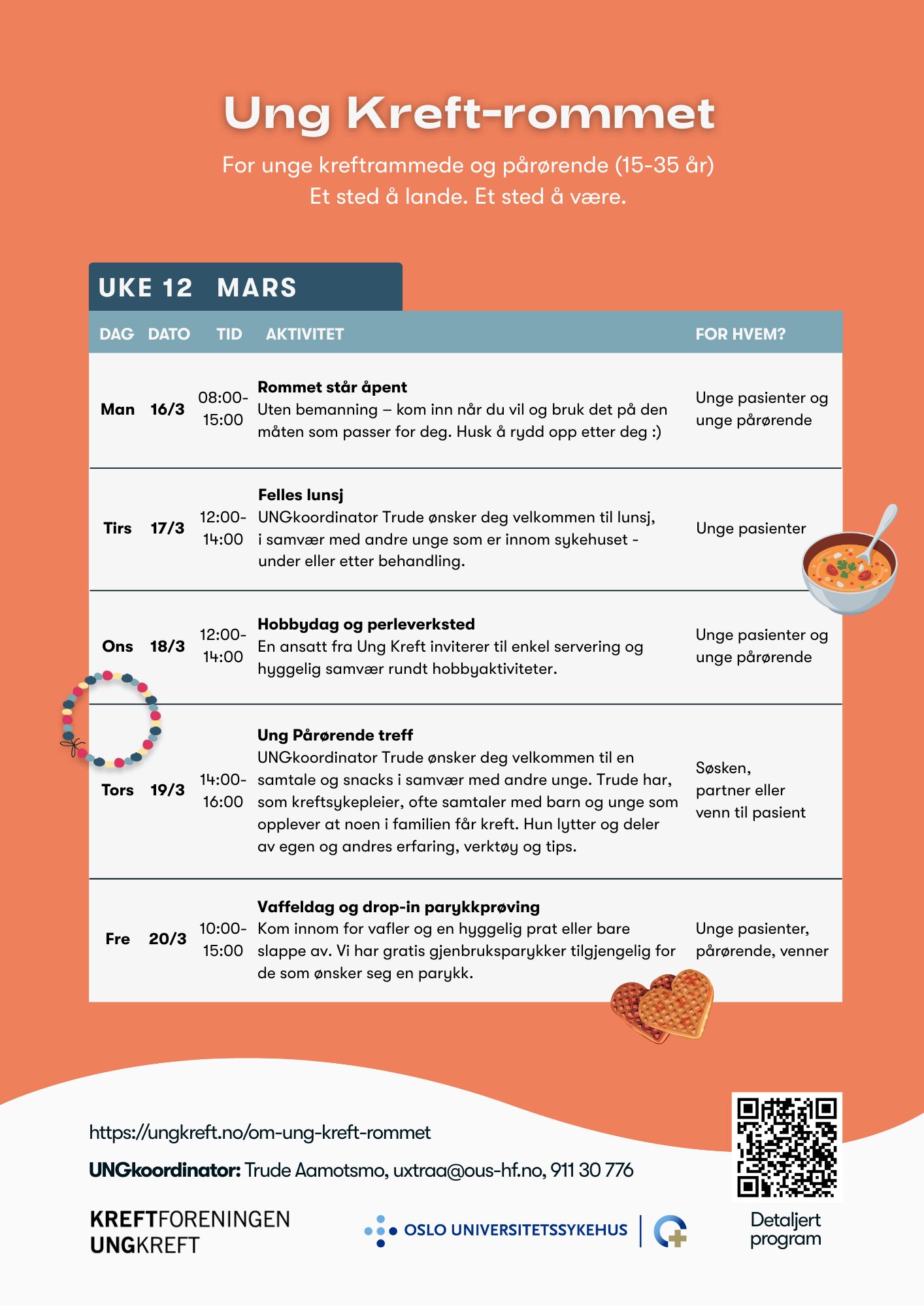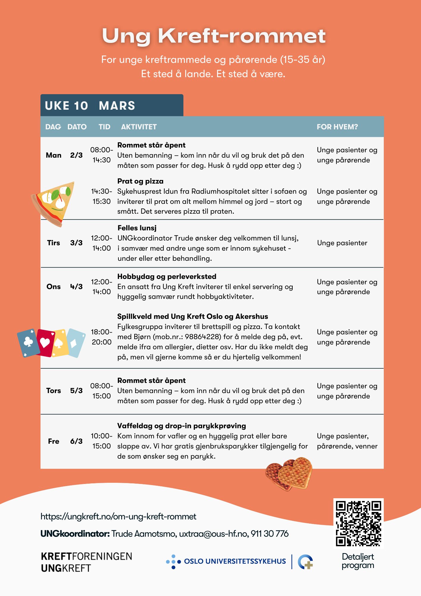 Her finner du oversikten over alt som skjer på Ung Kreft-rommet! Vi ønsker å tilby en variert kalender med både faglige og sosiale aktiviteter – alt tilpasset unge som er berørt av kreft, både kreftrammede og pårørende.