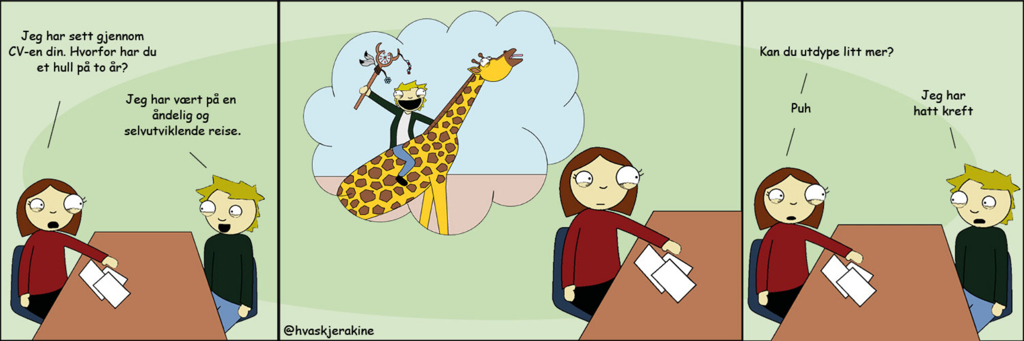 - Sykdom: Jeg har hatt kreft og vært en periode ute av arbeidslivet. Nå er jeg ferdig med behandlingen og klar for å jobbe.